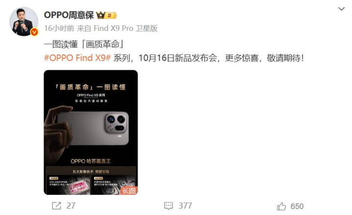 自从小米17系列发布后,各家就有点坐不住了,疯狂预热并爆料配置,就怕小米把用户全抢走,原本还要半个月才发布的oppo Find x9系列手机,现在基本上都给爆料的差不多了,官方还把oppo Find x9 pro的影像亮点提前发出来,根据此前爆料将会搭载天玑9500处理器,并配备7500mAh电池,爱拍照的用户可以期待。