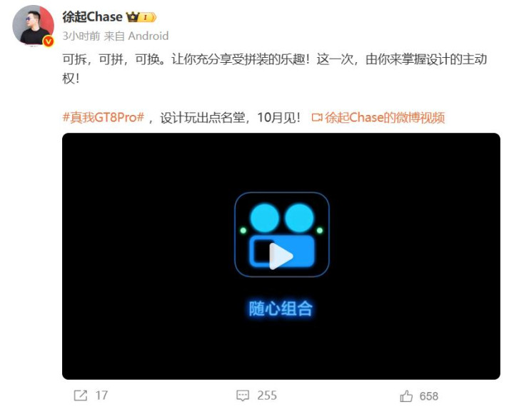 真我近期一直在预热新机,真我GT 8 pro很多细节都被曝光,外观设计比较独特,有吸引人的地方,相机模组设计很独特,看起来不是圆形也不是方形,而且还可以拼成圆形或者方形,有一种DIY的乐趣。