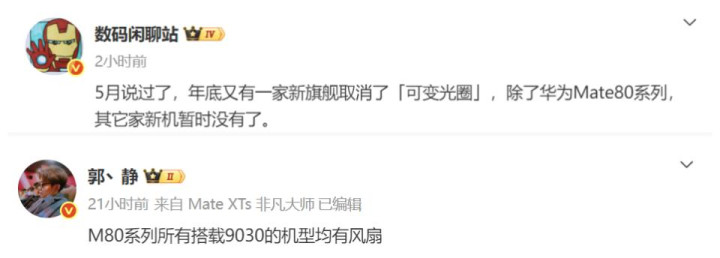 从影像上来说,有博主透露华为Mate80系列将继续搭载可变光圈技术,而其他国产品牌则暂时放弃了这一方向。